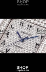 Diamonds Embedded Dial with Arabic Hour Numerals, Date Window at 6 O'Clock and Signature Cartier Markings at the 7 O'Clock Counter. Blue Sapphires on Stem Tip
