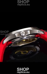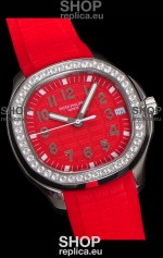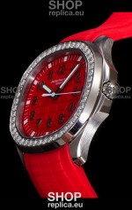 Red Colored Textured Dial with Date Window at 3 O'Clock. Diamonds Bezel
